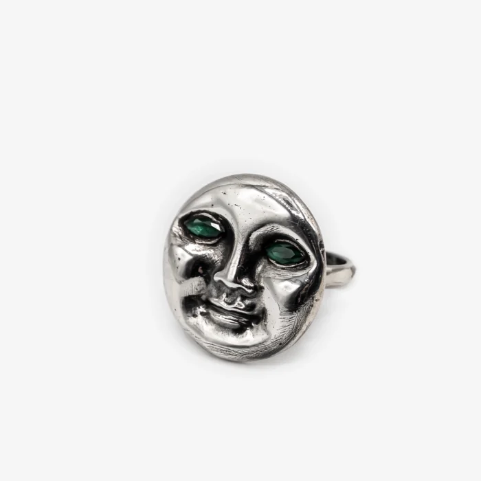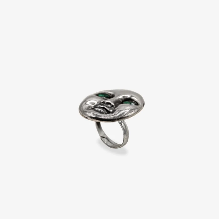 Inel realizat manual din argint pur 999 si pietre verzi Cubic Zirconia, antichizat . Inelul este reglabil pentru mai multe marimi.